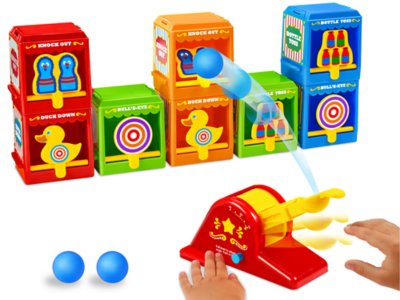Enter the world of carnival games introduced to you by our friendly clown. Our carnival game includes an adjustable launcher with 5 angle settings and 3 height settings 8 target booths that connect in tons of different waysand 3 balls kids use to test their skills as they aim for a variety of targets. Customs services and international tracking provided.